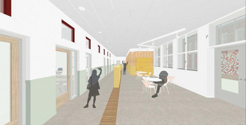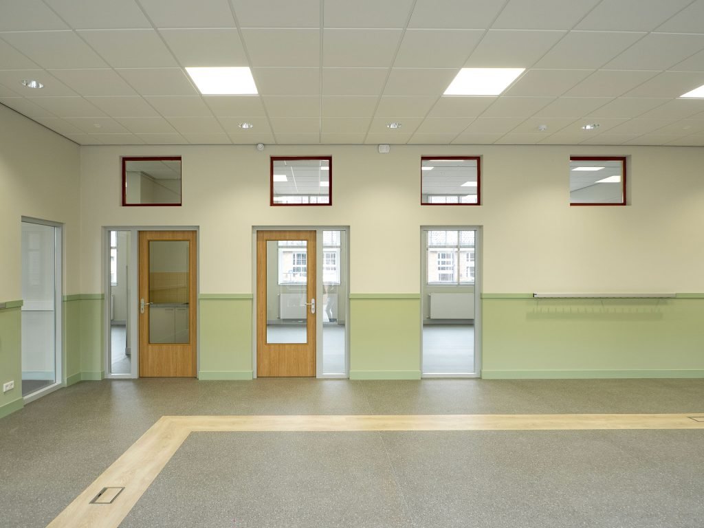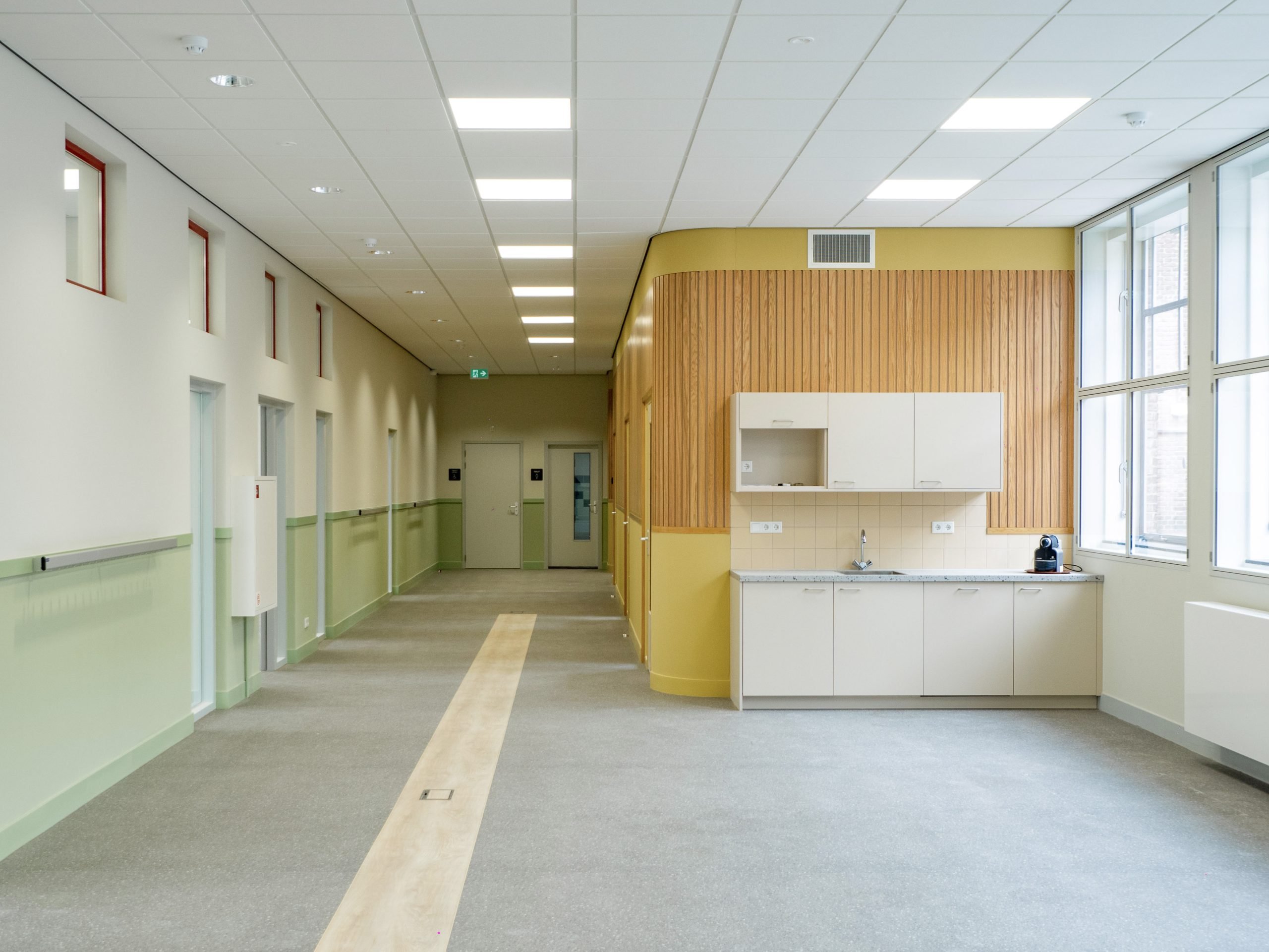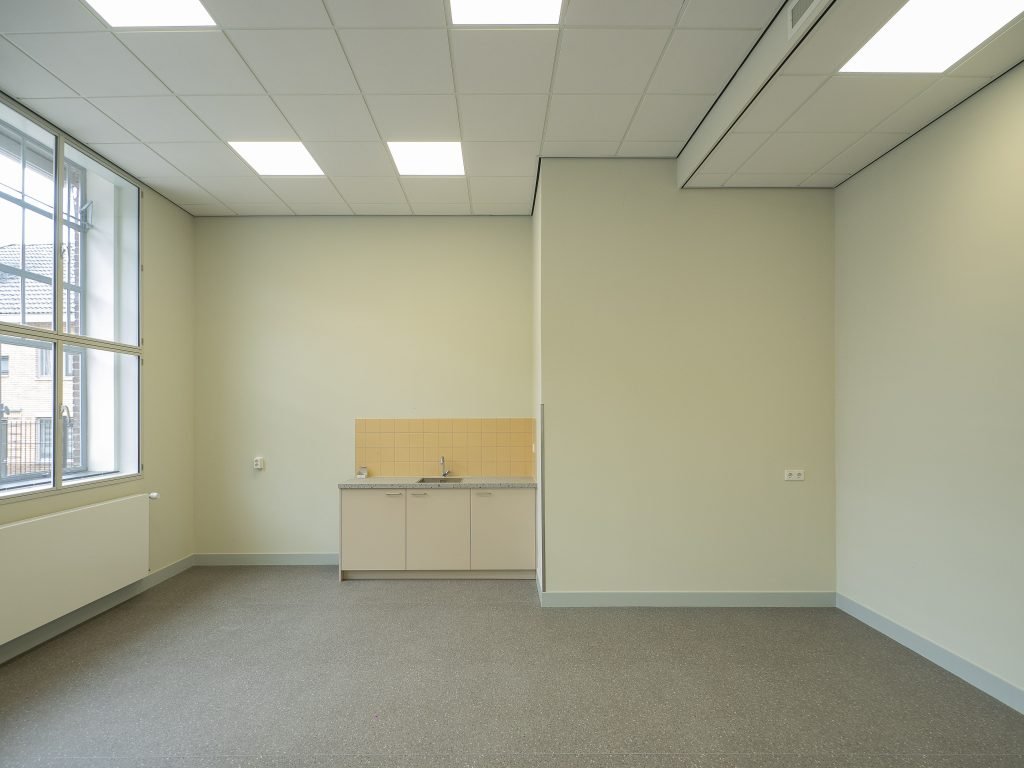 Voor de ruimtelijke indeling van de basisschool vleugel is een vergelijkbare structurele opzet en overgang van publiek naar privé toegepast zoals dit oorspronkelijk het geval was, toen de vleugel nog dienst deed als ziekenhuis. De lokalen zijn in een L-vorm gepositioneerd, en kijken uit op de straat. De resterende ruimte ligt aan het schoolplein, de verkeers- en studieruimte. In deze ruimte zijn verschillende nevenfuncties (kantoor, pantry, berging en printruimte) samengevoegd in één doosvolume met zachte/ronde hoeken, een vormentaal die op meerdere plaatsen in het gebouw terug komt. In de wanden naar de lokalen zijn ramen toegevoegd uitgelijnd met bestaande bovenramen.