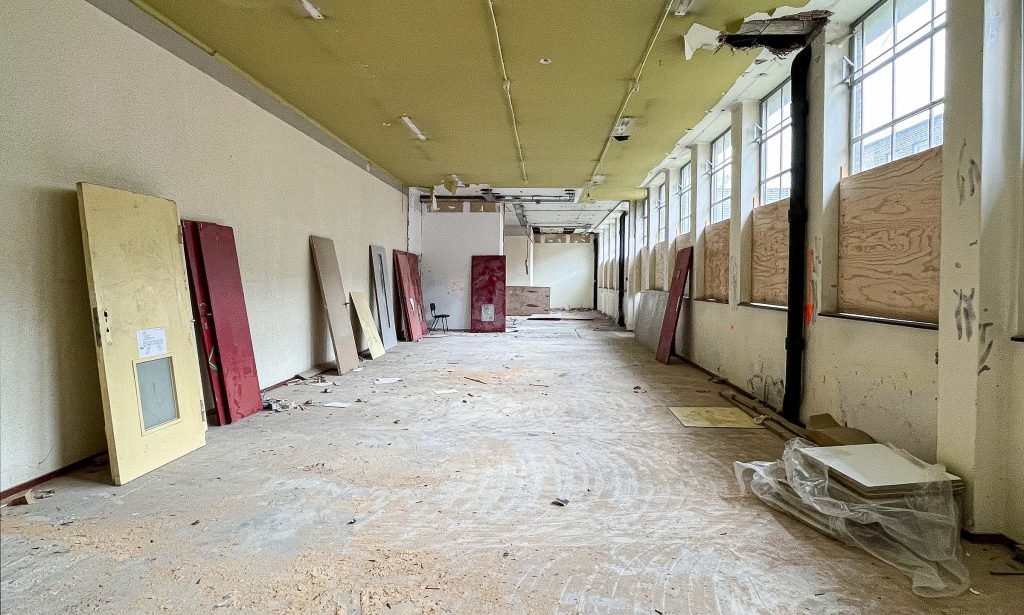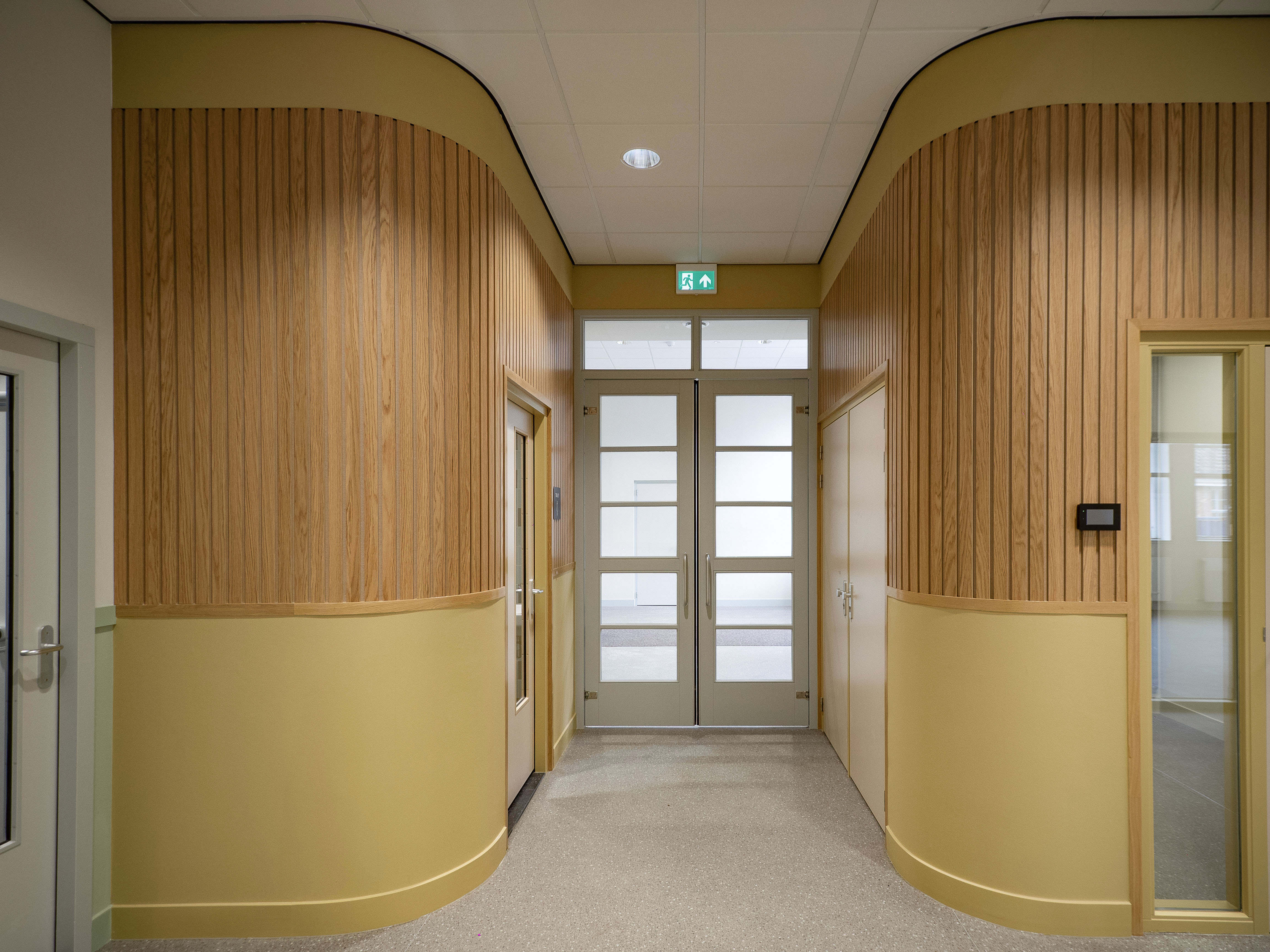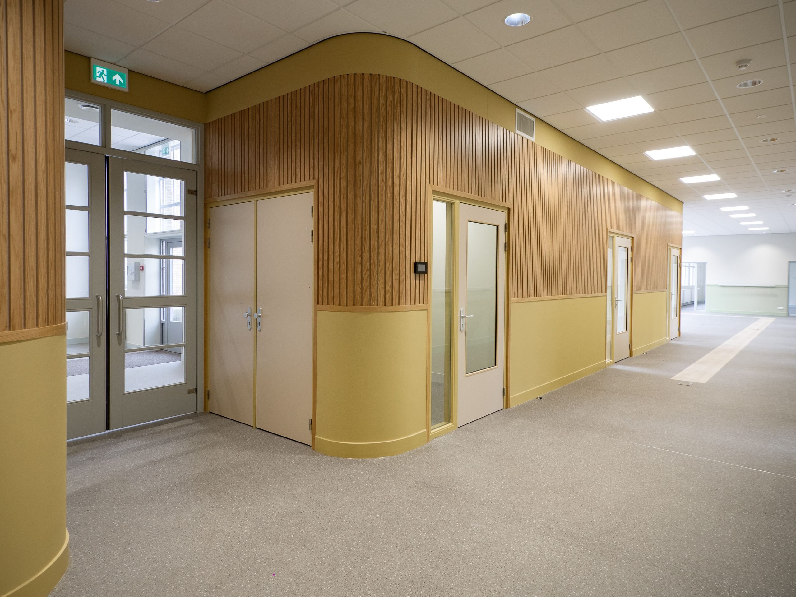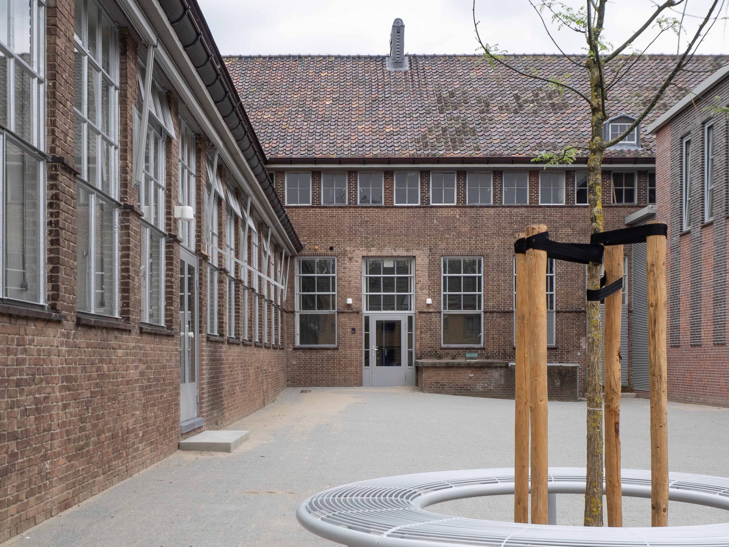 Voor de ruimtelijke indeling van de basisschool vleugel is een vergelijkbare structurele opzet en overgang van publiek naar privé toegepast zoals dit oorspronkelijk het geval was, toen de vleugel nog dienst deed als ziekenhuis. De lokalen zijn in een L-vorm gepositioneerd, en kijken uit op de straat. De resterende ruimte ligt aan het schoolplein, de verkeers- en studieruimte. In deze ruimte zijn verschillende nevenfuncties (kantoor, pantry, berging en printruimte) samengevoegd in één doosvolume met zachte/ronde hoeken, een vormentaal die op meerdere plaatsen in het gebouw terug komt. In de wanden naar de lokalen zijn ramen toegevoegd uitgelijnd met bestaande bovenramen.